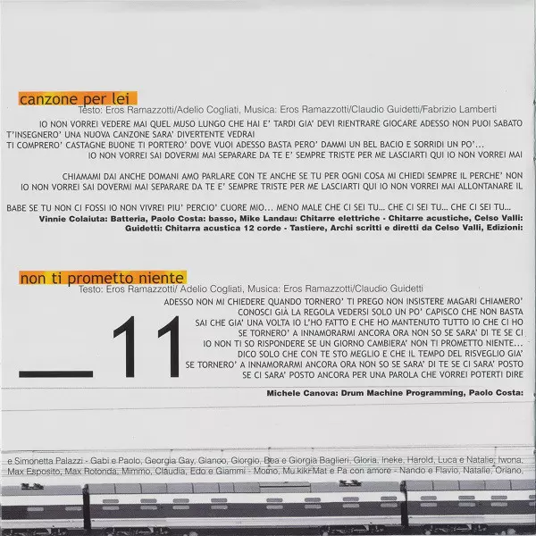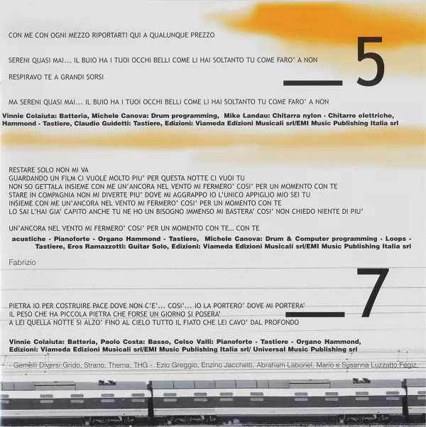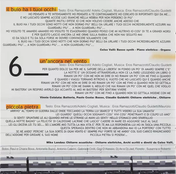 Arranged By [Strings], Conductor Celso Valli | Bass Paolo Costa | Drums Vinnie Colaiuta | Electric Guitar, Acoustic Guitar Michael Landau | Keyboards Celso Valli, Claudio Guidetti | Lyrics By Adelio Cogliati, Eros Ramazzotti | Music By Claudio Guidetti, Eros Ramazzotti, Fabrizio Lamberti | Piano, Organ [Hammond], Synth [Bass] Celso Valli | Twelve-String Guitar [Acoustic] Claudio Guidetti