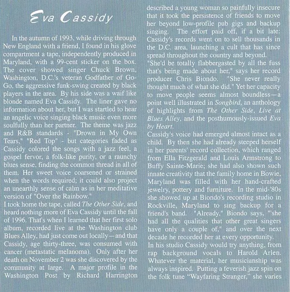 Bass Guitar Chris Biondo | Drums Raice McLeod | Electric Guitar Keith Grimes | Vocals, Acoustic Guitar Eva Cassidy | Written-By Curtis Mayfield