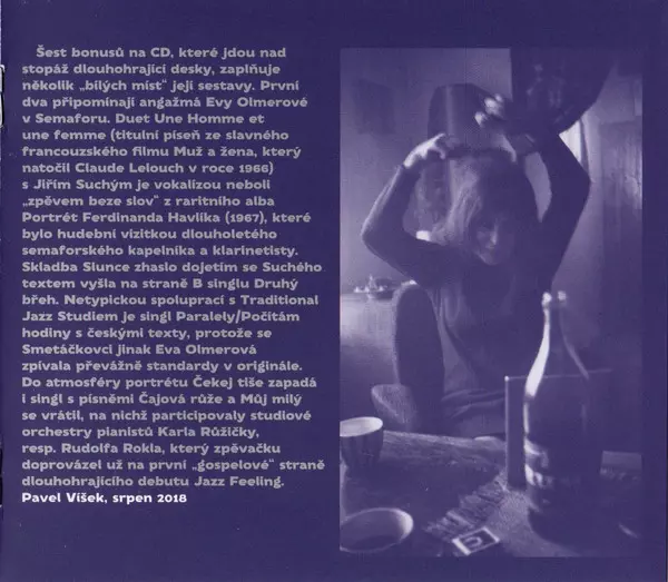 Eva Olmerová była znaną czeską wokalistką jazzową i bluesową, znaną z mocnego i emocjonalnego głosu. Urodziła się 21 stycznia 1934 roku w Czeskich Budziejowicach i stała się jedną z najwybitniejszych postaci muzyki czechosłowackiej w latach 60. i 70. ubiegłego wieku. Pomimo osobist...