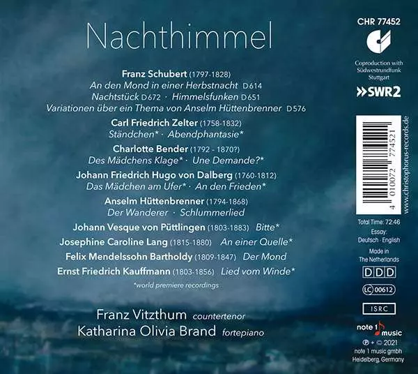 Franz Vitzthum: Nachthimmel Wersja na CD w standardowe wydanie. Ta konkretna edycja została wydana w Niemcy w wydawnictwie Christophorus dnia 15. stycznia 2021. Album sięga do gatunku Muzyka klasyczna i Romantyzm.