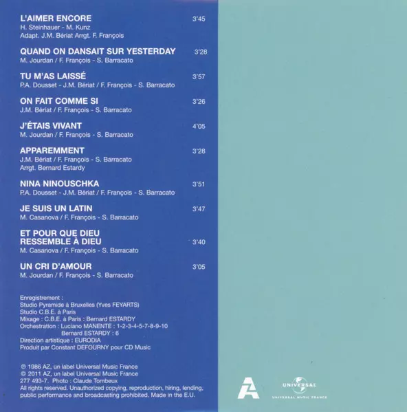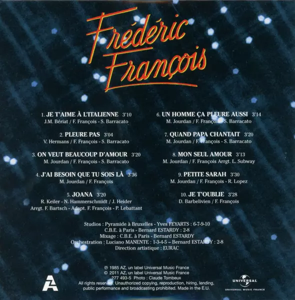 Frédéric François: L'intégrale Des Albums Originaux 1984-1992 Wersja na 9CD/Zestaw pudełkowy w standardowe wydanie. Ta konkretna edycja została wydana w Francja w wydawnictwie AZ dnia 10. listopada 2011. Album sięga do gatunku Pop i Chanson.