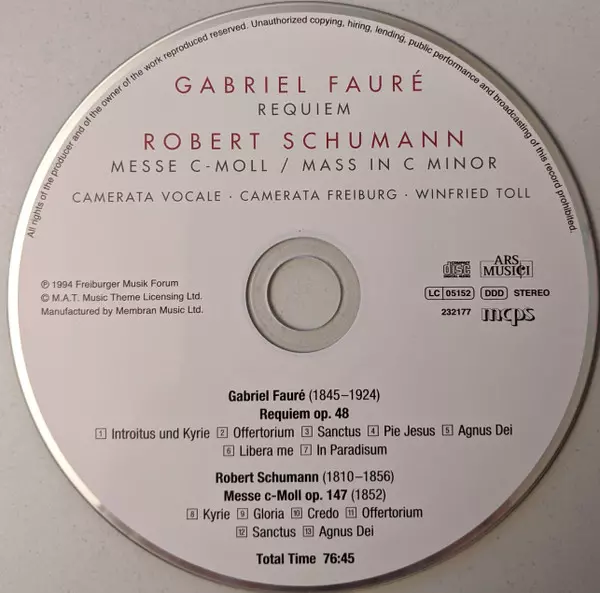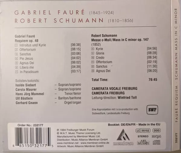 | Wykonawca | Robert Schumann | Gabriel Fauré | Camerata Vocale Freiburg | Winfried Toll | Camerata Freiburg |