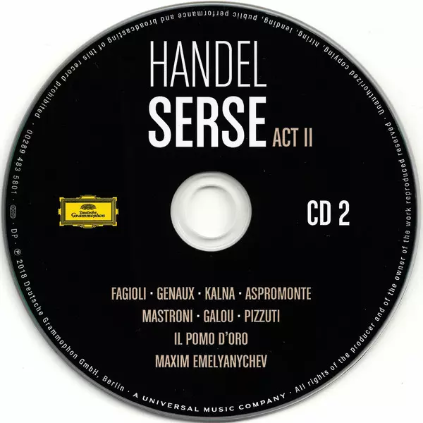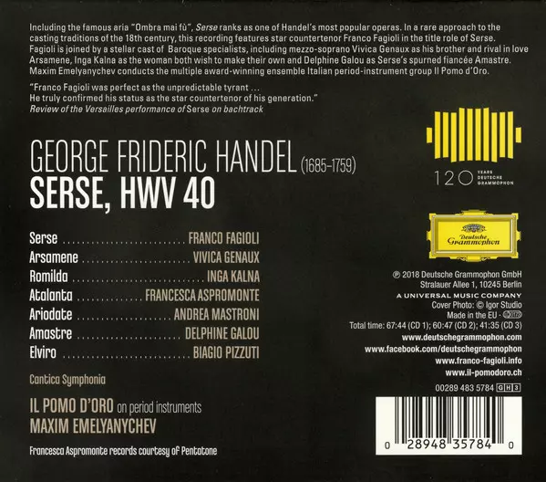Georg Friedrich Händel: Serse Wersja na 3CD/Zestaw pudełkowy w standardowe wydanie. Ta konkretna edycja została wydana w Europa w wydawnictwie Deutsche Grammophon dnia 2. listopada 2018. Album sięga do gatunku Muzyka klasyczna, Muzyka barokowa i Opera. Slipcase.