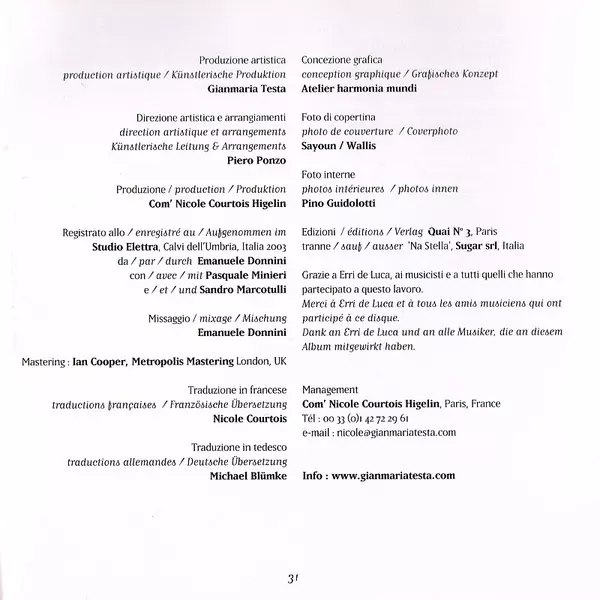 Cello Mario Brunello | Contrabass Enzo Pietropaoli | Drums Philippe Garcia | Lyrics By, Music By Gianmaria Testa | Violin, Viola Carlo De Martini | Vocals, Guitar Gianmaria Testa