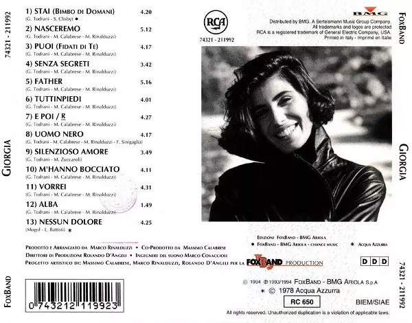 Giorgia: Giorgia Wersja na CD w standardowe wydanie. Ta konkretna edycja została wydana w Włochy w wydawnictwie Fox Band we współpracy z RCA i BMG dnia 30. czerwca 1998. Album sięga do gatunku Pop, Ballada i Europop.