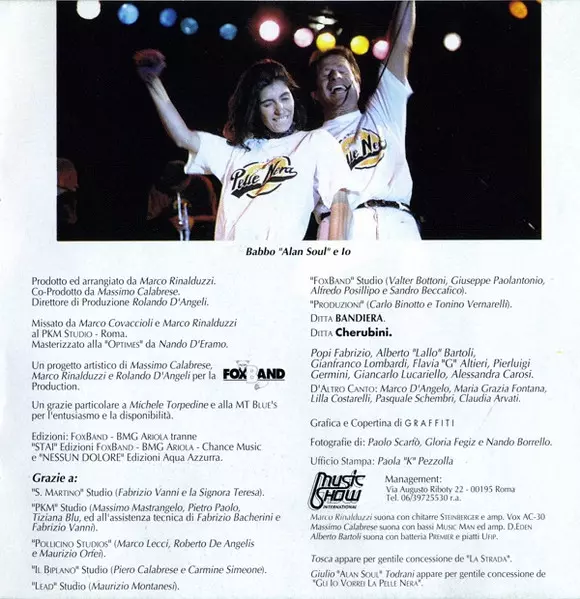 Arranged By [Wind Instruments] Marco Rinalduzzi, Pasquale Schembri | Backing Vocals [Il Corone] Alberto Bartoli, Alfredo Posillipo, Claudia Arvati, Fabio Sinigaglia, Giorgia, Giovanni Schembri, Giulio Todrani, Gloria Fegiz, Lilla Costarelli, Marco D'Angelo, Marco Rinalduzzi, Maria Grazia Fontana, Martino Fabrizio, Massimo Calabrese, Massimo Zuccaroli, Pasquale Schembri, Susanna Stivali | Engineer [Assistant] Marco Lecci, Sandro Beccafico | Engineer [Recording] Mark Covaccioli | Performer Gli Io Vorrei La Pelle Nera | Performer [Gli Io Vorrei La Pelle Nera], Alto Saxophone [Sax Contraalto] Ferruccio Corsi | Performer [Gli Io Vorrei La Pelle Nera], Baritone Saxophone Franco Marinacci | Performer [Gli Io Vorrei La Pelle Nera], Drums, Tambourine Alberto Bartoli | Performer [Gli Io Vorrei La Pelle Nera], Electric Bass Massimo Calabrese | Performer [Gli Io Vorrei La Pelle Nera], Electric Guitar Marco Rinalduzzi | Performer [Gli Io Vorrei La Pelle Nera], Lead Vocals Giulio Todrani | Performer [Gli Io Vorrei La Pelle Nera], Lead Vocals, Backing Vocals Giorgia | Performer [Gli Io Vorrei La Pelle Nera], Organ [Hammond] Maria Grazia Fontana | Performer [Gli Io Vorrei La Pelle Nera], Trombone Alfredo Posillipo | Performer [Gli Io Vorrei La Pelle Nera], Trumpet Pasquale Schembri, Pino Favale | Recorded By [Drums] Alfredo Posillipo, Marco Rinalduzzi | Written-By Fabio Sinigaglia, Giorgia Todrani, Marco Rinalduzzi, Massimo Calabrese