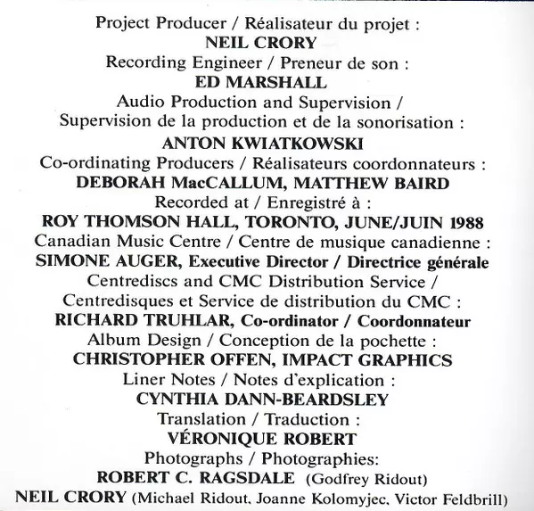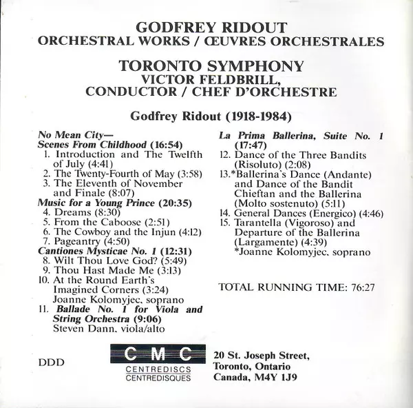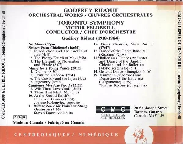 | Wykonawca | Toronto Symphony Orchestra | Godfrey Ridout | Victor Feldbrill | Joanne Kolomyjec | Steven Dann |