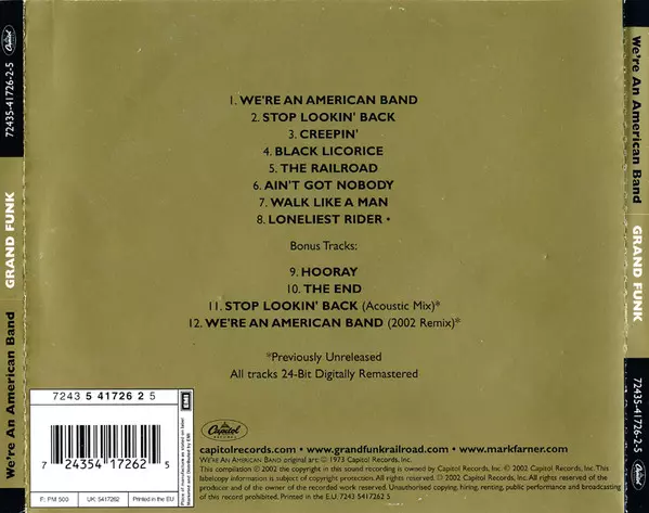 Grand Funk Railroad The 1973 album We're An American Band is one of the band's most successful albums. The album includes the hit singles "We're An American Band" and "Walk Like a Man". The album was certified platinum by the RIAA.