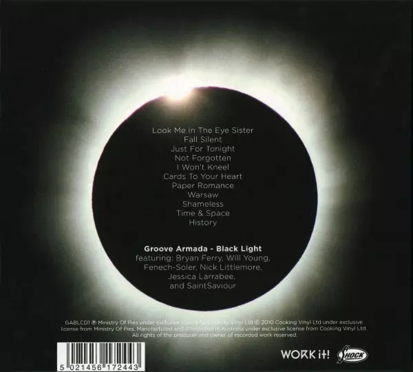 Groove Armada: Black Light Wersja na CD w standardowe wydanie. Ta konkretna edycja została wydana w Australia w wydawnictwie WORKit! we współpracy z Shock (2) dnia 18. czerwca 2021. Album sięga do gatunku Muzyka elektroniczna, New Wave i Electro.