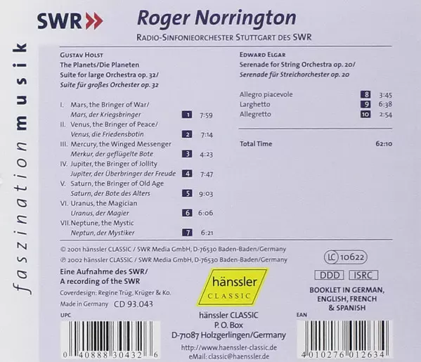 | Wykonawca | Gustav Holst | Sir Edward Elgar | Radio-Sinfonieorchester Stuttgart | Roger Norrington |