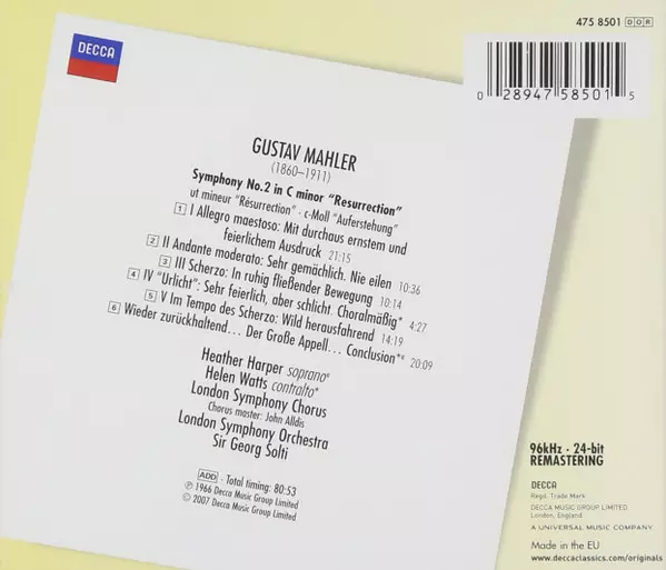 | Wykonawca | The London Symphony Orchestra | Gustav Mahler | Georg Solti | Heather Harper | Helen Watts |