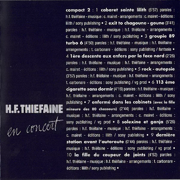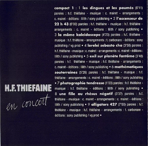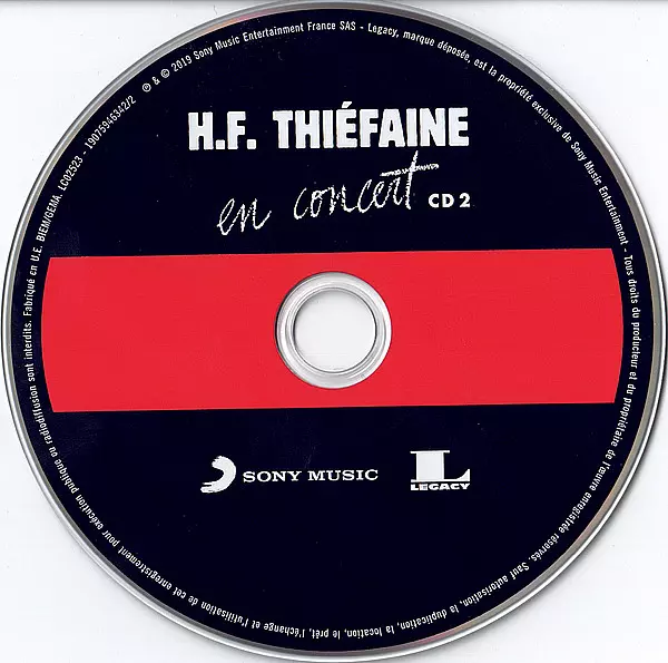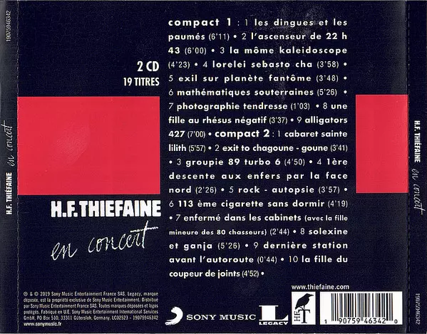 Hubert Félix Thiéfaine: En Concert Wersja na 2CD w standardowe wydanie. Ta konkretna edycja została wydana w Francja w wydawnictwie Legacy we współpracy z Sony Music dnia 5. lipca 2019. Album sięga do gatunku Rock, Pop, Pop Rock i Chanson.
