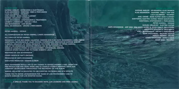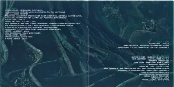 Bass Guitar, Bass Clarinet, Electric Guitar Axel Crone | Drums Kjell Severinsson | Electric Guitar Samuel Hällkvist | Electronic Drums, Percussion Pat Mastelotto | Keyboards, Electronics Katrine Amsler | Koto, Voice Karin Nakagawa | Marimba, Vibraphone [Vibes], Tam-tam, Gong Klas Assarsson | Percussion Xerxes Andrén | Synthesizer [ARP 2600, Mini Moog Model D, Moog Sub 37, Nord Lead A1, Roland RS-202 String Machine, Sequential Circuits Pro One, Yamaha CS80, Oberheim Xpander], Effects [Treatments], Mellotron Mats Johansson (13) | Trumpet Luca Calabrese | Violin Liesbeth Lambrecht | Vocals Peter Hammill