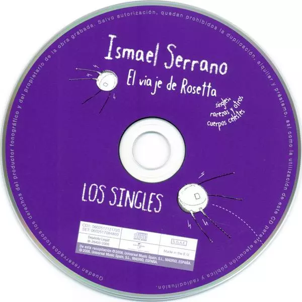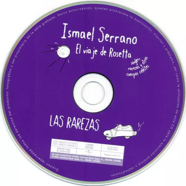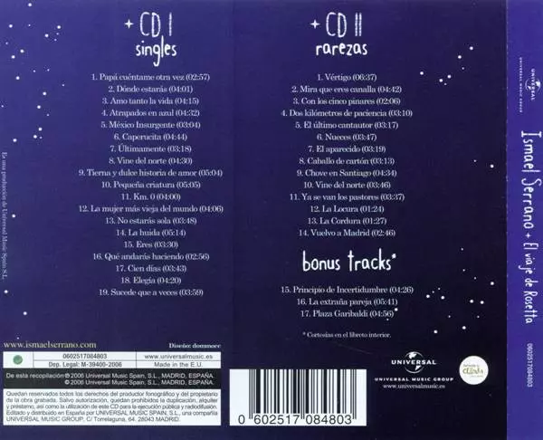 Ismael Serrano: El Viaje De Rosetta - Singles, Rarezas Y Otros Cuerpos Celestes Wersja na 2CD/Zestaw pudełkowy w standardowe wydanie. Ta konkretna edycja została wydana w Hiszpania w wydawnictwie Universal Music Group dnia 19. grudnia 2006. Album sięga do gatunku Rock, Muzyka akustyczna i Soft Rock.