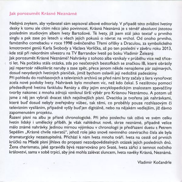 Iveta Bartošová Beautiful Unknown is a great album that was released in 2016. It's a mix of pop and rock music that is really enjoyable to listen to. All the songs are well written and played and Iveta's voice sounds great. If you are looking for a new album to listen to, I highly recommend Beautiful Unknown.