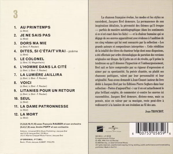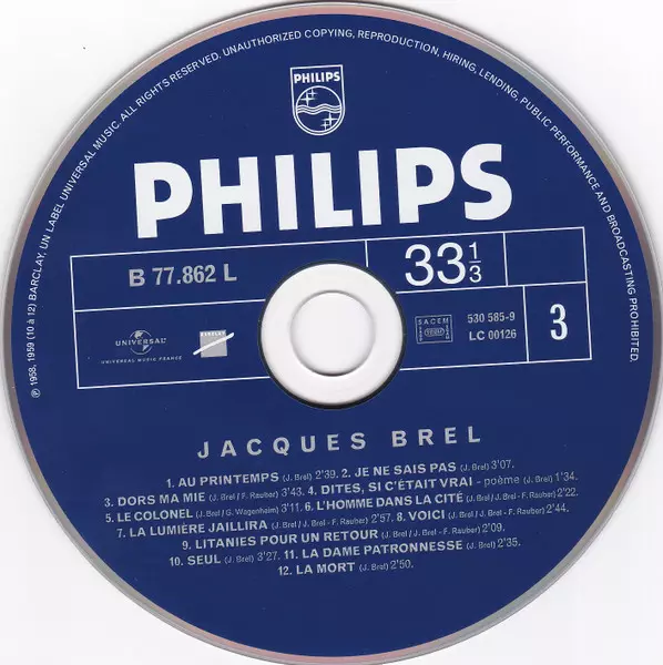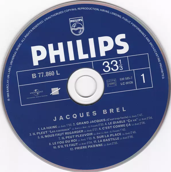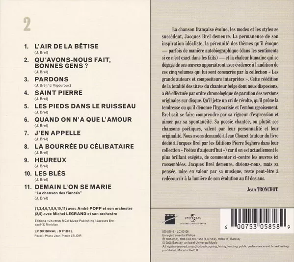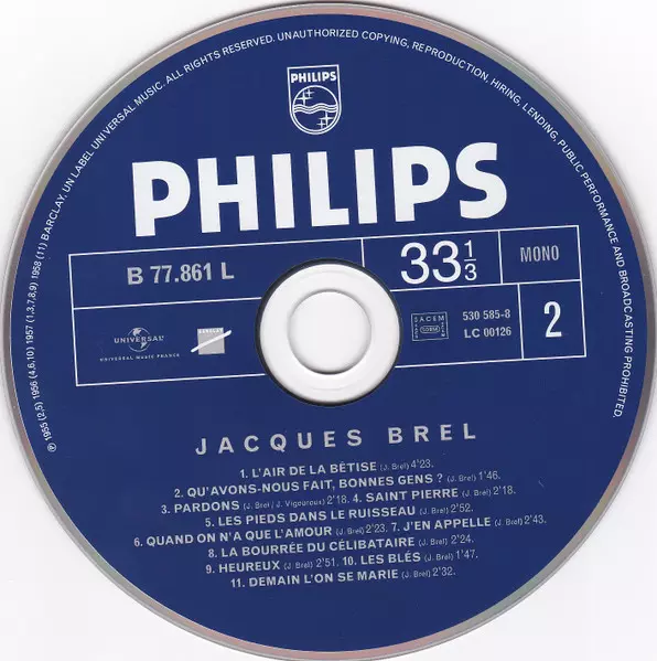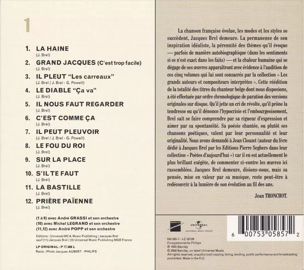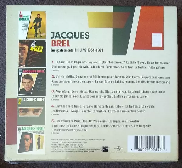 Jacques Brel: Enregistrements Philips 1954-1961 Wersja na 5CD/Zestaw pudełkowy w zremasterowane wydanie. Ta konkretna edycja została wydana w Francja w wydawnictwie Barclay we współpracy z Universal dnia 14. grudnia 2018. Album sięga do gatunku Pop i Chanson.