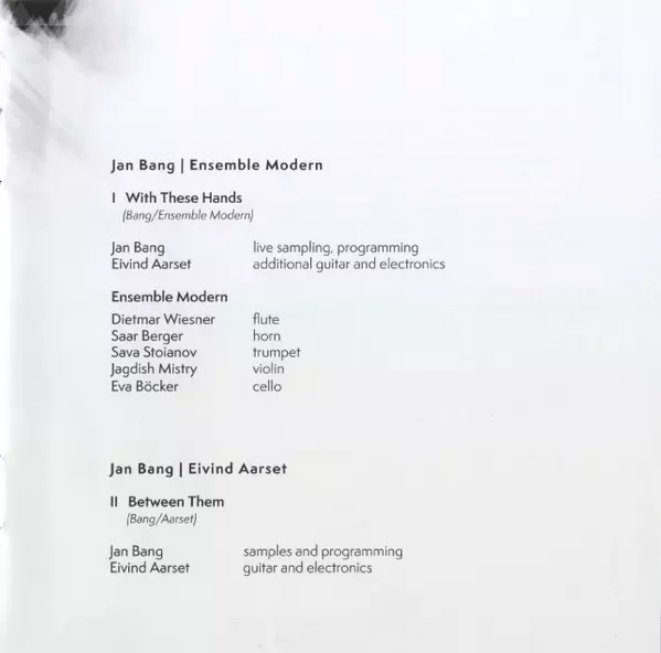 | Cello Eva Böcker | Composed By Ensemble Modern, Jan Bang | Ensemble Ensemble Modern | Flute Dietmar Wiesner | Horn Saar Berger | Mixed By, Edited By Dai Fujikura | Recorded By Norbert Ommer | Sampler [Live Sampling], Programmed By [Programming] Jan Bang | Trumpet Sava Stoianov | Violin Jagdish Mistry | |||