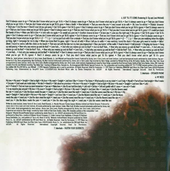 Drum Programming Alex Richbourg | Engineer [Assistant], Mixed By [Assistant] Brad Yost, Xavier Smith | Engineer, Mixed By Steve Hodge | Featuring Joni Mitchell, Q-Tip | Instruments [All Other Musical Instruments] Jimmy Jam & Terry Lewis | Lead Vocals, Backing Vocals Janet Jackson | Performer [Samples From "Big Yellow Taxi"] Joni Mitchell | Rap Q-Tip | Recorded By [Rap, Assistant] Michael McCoy | Recorded By [Rap] Steve Hodge | Written-By James Harris III, Janet Jackson, Joni Mitchell, Kamaal Fareed, René Elizondo Jr., Terry Lewis