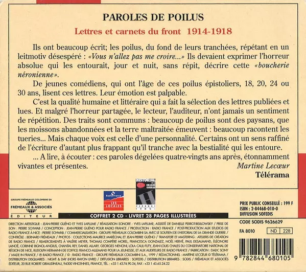 Paroles De Poilus. Lettres Et Carnets Du Front 1914-1918 - CD