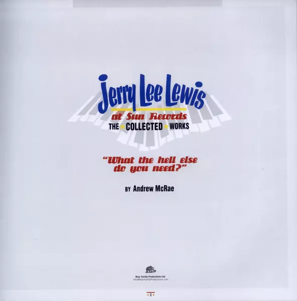Jerry Lee Lewis: Jerry Lee Lewis At Sun Records - The Collected Works ("What The Hell Else Do You Need?") DLX Wersja na 18CD/Zestaw pudełkowy w deluxe wydanie. Ta konkretna edycja została wydana w Niemcy w wydawnictwie Bear Family Productions Ltd. dnia 13. listopada 2015. Album sięga do gatunku Rock, Folk, World, & Country, Blues i Rock & Roll.