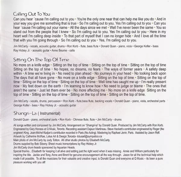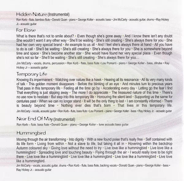 Acoustic Guitar Ray Hickey Jr. | Bass George Koller | Flute, Bass Flute, Backing Vocals Ron Korb | Piano Donald Quan | Vocals, Acoustic Guitar, Drums Jim McCarty