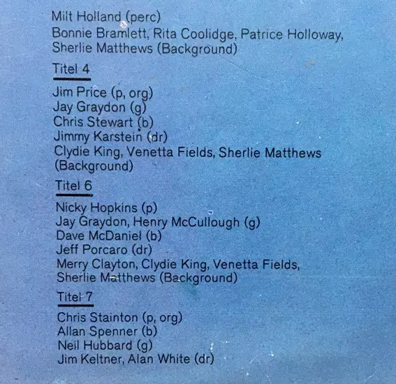 Backing Vocals Clydie King, Merry Clayton, Sherlie Matthews, Venetta Fields | Bass Dave McDaniel | Drums Jeff Porcaro | Guitar Henry McCullough, Jay Graydon | Piano Nicky Hopkins | Written-By Jim Price