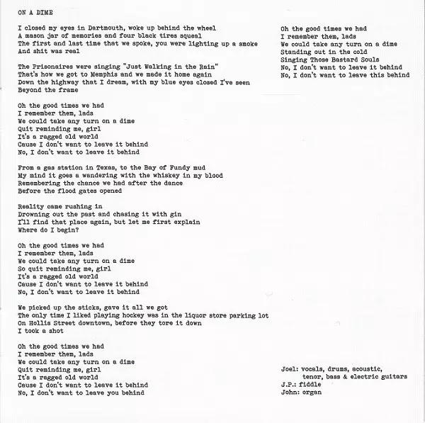 Baritone Guitar [Baritone Electric Guitar] Peter Elkas | Bass Guitar Tim Brennan | Fiddle J.P. Cormier | Piano John Boudreau | Vocals, Acoustic Guitar, Drums Joel Plaskett