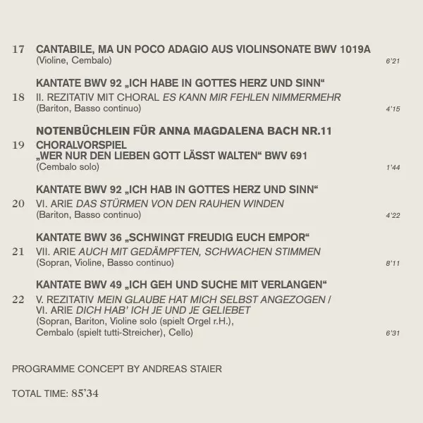 | Wykonawca | Johann Sebastian Bach | Andreas Staier | Roel Dieltiens | Anna Lucia Richter | Petra Müllejans | Georg Nigl |
