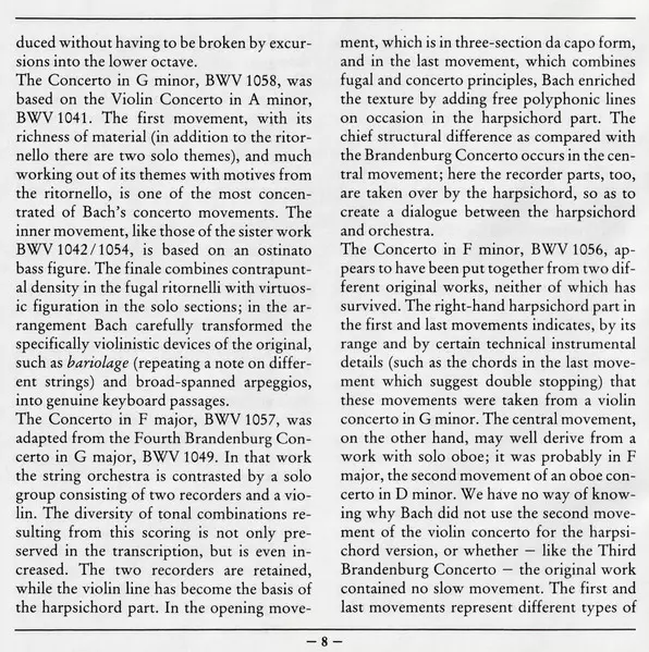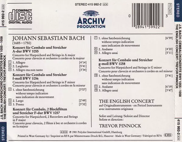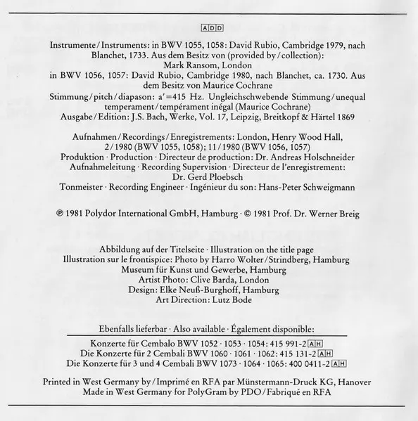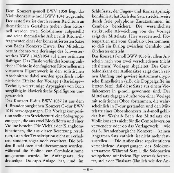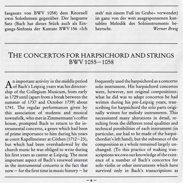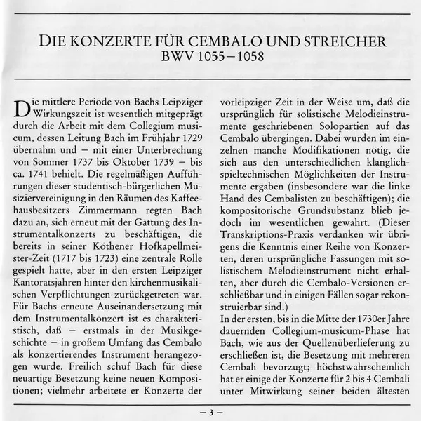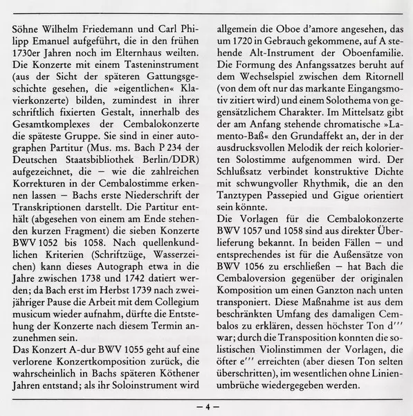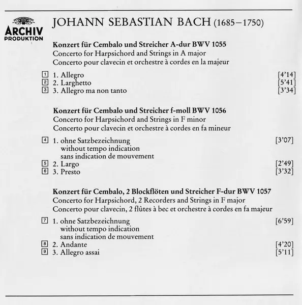 | Tytuł | Konzerte Für Cembalo Und Streicher = Concertos For Harpsichord And Strings = Concertos Pour Clavecin Et Orchestre À Cordes BWV 1055 · 1056 ·1057 · 1058 |
