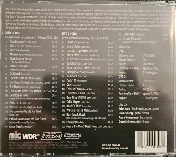 John Cale & Band: Live At Rockpalast Wersja na 2CD/2DVD w standardowe wydanie. Ta konkretna edycja została wydana w Niemcy w wydawnictwie MIG dnia 3. listopada 2023. Album sięga do gatunku Rock, Art Rock, Avant-garde i Classic Rock.