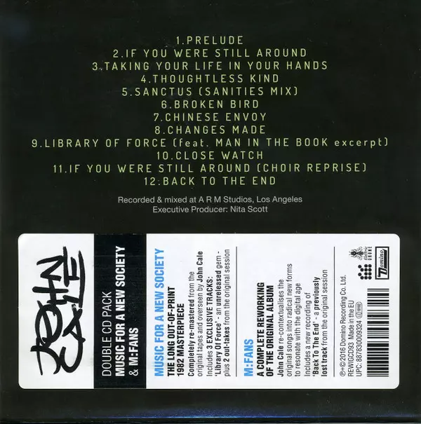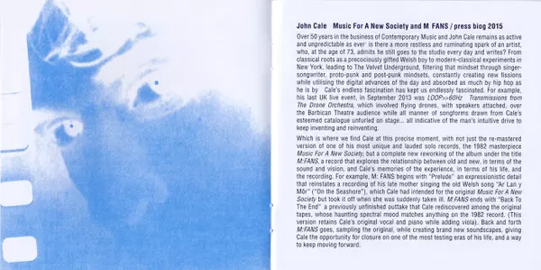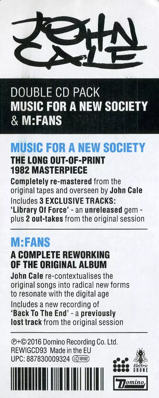 John Cale: Music For A New Society / M:FANS Wersja na 2CD w zremasterowane wydanie. Ta konkretna edycja została wydana w Europa i Wielka Brytania w wydawnictwie Domino we współpracy z Electric Drone dnia 5. lutego 2016. Album sięga do gatunku Rock, New Wave i Art Rock.