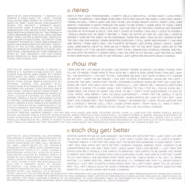 Arranged By [Strings] Stephen Barber | Bass David Piltch | Cello Elizabeth Dyson | Drums Larry Eagle | Mixed By Tony Maserati | Mixed By [Assisted By] Ichiho Nishiki | Viola Nicholas Cords | Violin Sharon Yamada | Violin, Concertmaster Sandra Park | Vocals, Piano John Legend | Written-By John Stephens (3)