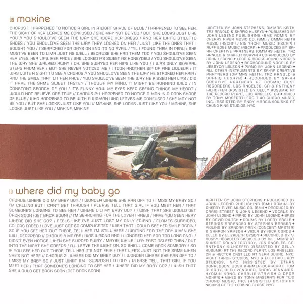 Arranged By [String Arrangement] Daniele Luppi | Backing Vocals Jessyca Wilson, Sasha Allen | Bass Guitar David Piltch, Eric Hudson | Drum Programming Jack Splash | Drums [Live] Earl Harvin | Guitar Chris Bruce, David Torn, Doyle Bramhall II | Horns Jason Freeman, Jerry Freeman, Kebbi Williams, Richard Owens | Keyboards Didi Gutman, Jamie Muhoberac, Patrick Warren | Lead Vocals, Backing Vocals John Legend | Mixed By Tony Maserati | Mixed By [Assisted By] Andy Marcinkowski | Piano Eric Hudson | Trombone Art Baron | Violin Caterina Szepes, Jung Sun Yoo, Katherine Fong, Krzysztof Kuznik, Kuan Lu, Lisa Kim, Mateuz Wolski, Sarah O'Boyle, Sharon Yamada, Soo Hyun Kwon, Wen Qian | Violin, Concertmaster Sandra Park | Written-By Eric Hudson, Jessyca Wilson, John Stephens (3), Kawan Prather