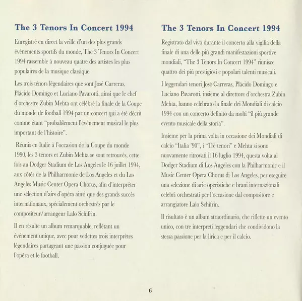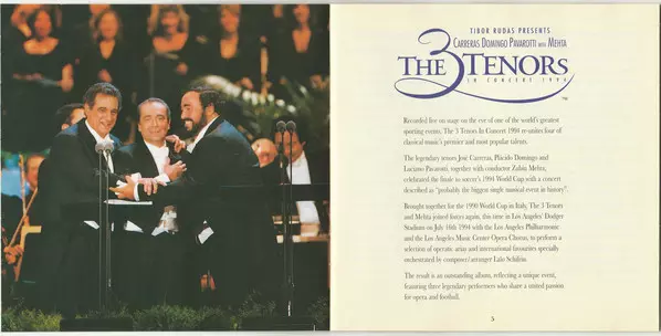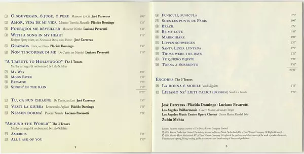 | Wykonawca | Luciano Pavarotti | Placido Domingo | José Carreras | Zubin Mehta |