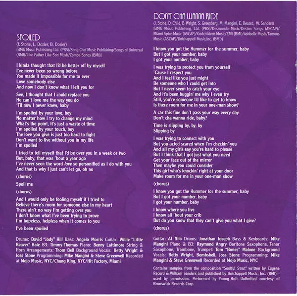 Arranged By [Strings] John Angier | Backing Vocals Betty Wright, Bombshell (7), Clovette Danzy, Ellison Kendrick, Jeanette Wright, Margaret Reynolds, Mercedes Martinez, Ruby Baker, Tracey Moore, Veronica Sanchez, William "Kooly" Scott | Bass Jack Daley | Drums Cindy Blackman | Electric Piano [Rhodes] Angie Stone | Flugelhorn Tom Malone | Guitar Al Nilo, Angelo Morris, Danny P. | Organ [B3], Piano Raymond Angry | Programmed By Mike Mangini, Steve Greenwell | Written-By Daniel "Danny P" Pierre, Joss Stone, Steve Greenberg