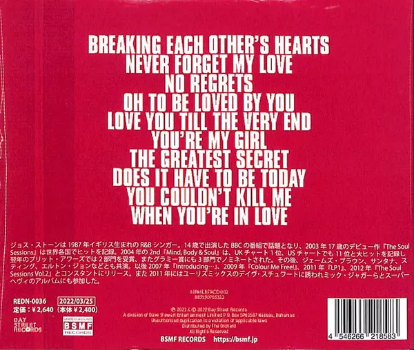 Joss Stone: Never Forget My Love Wersja na CD w standardowe wydanie. Ta konkretna edycja została wydana w Japonia w wydawnictwie BSMF Records dnia 1. kwietnia 2022. Album sięga do gatunku Funk / Soul i Gospel.