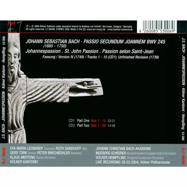 | Wykonawca | Johann Sebastian Bach | Philippe Herreweghe | Klaus Mertens | Gerd Türk | Ruth Sandhoff | Kölner Kantorei | Eva Maria Leonardy | Peter Brechbühler | Johann Christian Bach-Akademie |