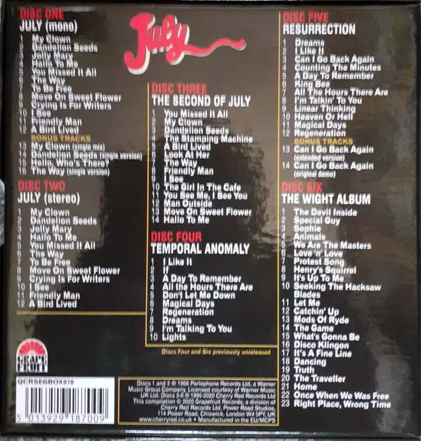 July: The Complete Recordings DLX Wersja na 6CD/Zestaw pudełkowy w zremasterowane deluxe wydanie. Ta konkretna edycja została wydana w WIELKA BRYTANIA w wydawnictwie Grapefruit Records dnia 31. lipca 2020. Album sięga do gatunku Rock, Pop i Psychedelic rock.