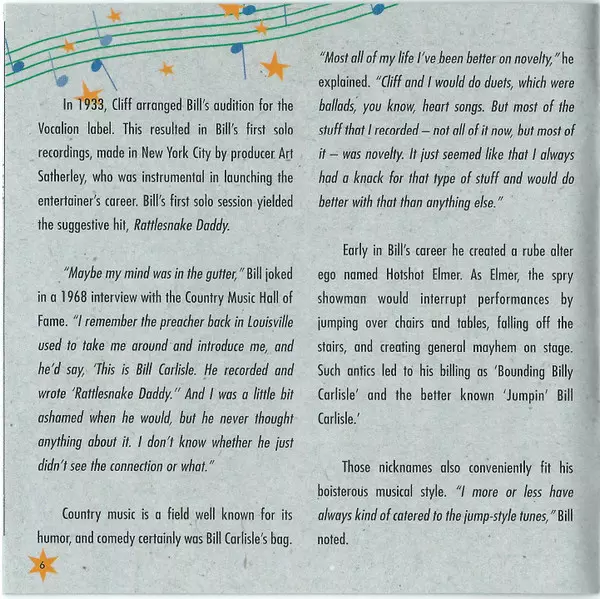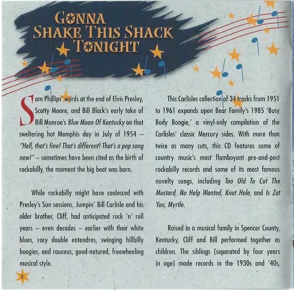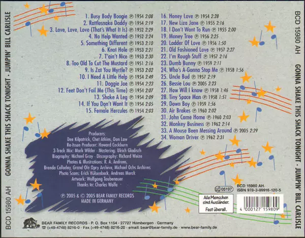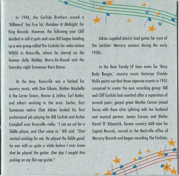 Bill Carlisle: Busy Body Boogie Wersja na CD w standardowe wydanie. Ta konkretna edycja została wydana w Niemcy w wydawnictwie Bear Family Records dnia 12. lipca 2005. Album sięga do gatunku Folk, World, & Country i Country.