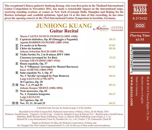 Wykonawca | Johann Sebastian Bach | Isaac Albéniz | Mario Castelnuovo Tedesco | Kaspar Joseph Mertz | Enrique Granados | Agustín Barrios Mangoré | Luigi Legnani | Junhong Kuang |