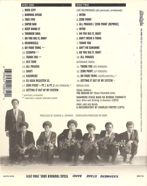 Kashmere Stage Band: Texas Thunder Soul 1968-1974 : Expanded Deluxe Edition Wersja na 2CD/DVD w zremasterowane wydanie. Ta konkretna edycja została wydana w USA w wydawnictwie Now-Again Records dnia 12. stycznia 2012. Album sięga do gatunku Jazz, Funk / Soul, Big Band i Jazz-Funk.