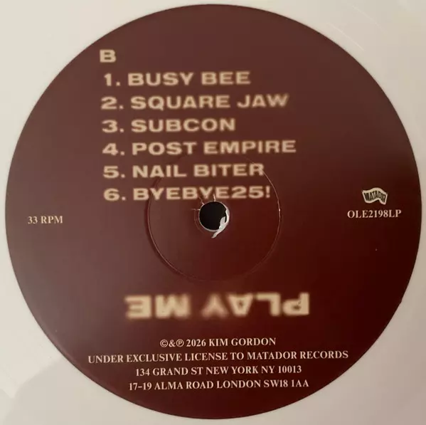 Kim Gordon: Play Me CLR | LTD Wersja na winylu LP w kolorowane ograniczone wydanie. Ta konkretna edycja została wydana w USA w wydawnictwie Matador dnia 13. marca 2026. Album sięga do gatunku Rock, Muzyka elektroniczna, Hip Hop, Leftfield, Experimental Rock, Noise Rock, Synth Punk, Electro-Industrial i Post-Industrial. White Coloured Vinyl Limited Edition.