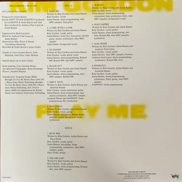 Drum Programming, Sampler [Akai MPC Sampler], Drum Machine [Roland 808] Justin Raisen | Vocals, Guitar Kim Gordon | Written-By Justin Raisen, Kim Gordon