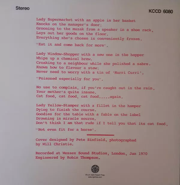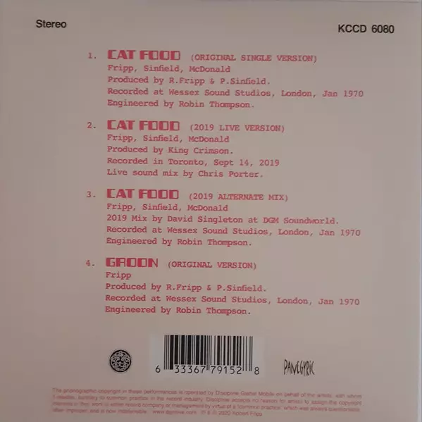 50th Anniversary Reissue In 2020, 50 years after the release of King Crimson's first non-album single, fans of the rock legend can look forward to two special releases: a CD and the 10" single "Cat Food" (50th Anniversary Edition). The recording features the original songs "Cat Food" (single version) and "Groon" (B-side), as well as another live...