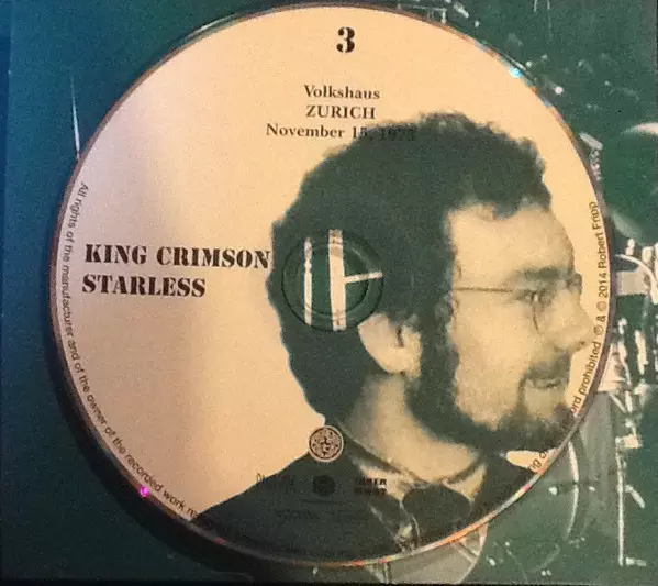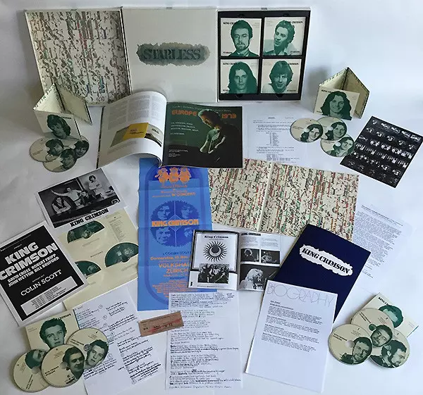 - 19 CDs of live recordings - 7 of the CDs are multi-track recordings, including 4 CDs of material from the Glasgow and Zurich concerts that David Singleton re-assembled and re-mastered in high definition from the original Great Deceiver mixes in 2014. The Amsterdam show "The Nightwatch" edited by Steven Wilson and previously unheard material from the same concert edited by George Chkiantz (the sound engineer who edited all the live KC concerts from this and the red era). - The 11 CDs are from high quality stereo tapes, 8 of which are heard on CD for the first time and the remaining 3 have been remastered or re-recorded - One CD features footage from ORTF TV in Paris - CD 20 contains a stereo mix of Steven Wilson and Robert Fripp's 2011 album "Starless & Bible Black" - DVD-A 1 contains the "Starless & Bible Black" album in 5.1 surround sound with the new and original high-resolution stereo mix and additional bonus material - DVD-A 2 contains material from the Mainz (David Singleton mix), Amsterdam (Steven Wilson mix) and later Pittsburgh concerts (George Chkiantz mix) in 4-part, high-resolution stereo. - Both DVD-A discs are playable in Region 0 and compatible with DVD players worldwide - Blu-ray Disc 1 contains lossless audio transfers of 24/192 material from the Glasgow and Zurich concerts, recompiled and remastered in 2014 by David Singleton from the original Great Deciever mixes in LPCM stereo. - Blu-ray Disc 1 also includes the Amsterdam show "The Nightwatch" mixed by Steven Wilson and a stereo mix prepared by George Chkiantz in 24/96 High-Resolution Stereo and a 24/96 transfer from the original mixes of "The Nightwatch" by David Singleton and Robert Fripp - Blu-ray Disc 2 includes Starless & Bible Black in 5.1 surround sound (DTSHD MAS and LPCM 24/96) along with the new and original stereo masters of the album, as well as a vinyl transfer of the original vinyl pressing and numerous audio extras. - Blu-ray Disc 2 also includes quadraphonic mixes of material from the Munich, Amsterdam and Pittsburgh concerts. - The discs are housed in eight 3-disc digipacks in an LP-sized box - Included are 3 additional bonus CDs with restored recordings/bootlegs and audio curiosities - One additional concert (bootleg quality audio) is included as a download code. - Included is an LP-sized booklet with rare/never-before-seen photos, new liner notes by Sid Smith, technical notes on the recordings by David Singleton, testimonials from fans who were at the concerts, and memorabilia such as album prints, posters, replica concert tickets, press releases, photos, and more - The box is limited to the first edition. David Cross: violin and keyboards Robert Fripp: guitar and mellotron John Wetton: bass and voice Bill Bruford: percussion Live in Europe October/November 1973, March/April 1974 Studio recordings in London, England, January 1974 Few bands of the era offered such a variety of material night after night at their concerts as King Crimson. Their penchant for improvisation and penchant for playing the latest material, often unreleased at the time of the concerts, is legendary. Fewer bands, whether by accident or design, have recorded as many of their concerts. Starless offers an in-depth look at one of the most important bands of the era in one of its most celebrated lineups. Autumn 1973: when King Crimson's second longest American tour ended that year, a small tour of England followed in late October, and a more extensive European tour was already planned for November. Three concerts in Glasgow, Zurich and Amsterdam were recorded on multi-track tapes. The material from Amsterdam was used as the basis for the album "Starless & Bible Black", which was released in January 1974. From mid-March to the end of April, the band toured Europe again, promoting the album with their last European shows of the 1970s before leaving for another US tour. Some of these concerts were recorded on stereo tapes directly from the loudspeaker on the night of the concert. These recordings were often referred to as "The Blue Tapes" (after the color of the original boxes) and are prized for the quality of the recordings and performances. The box set presents 18 CDs of live recordings, seven of which are mixed from the 1973 multi-track tapes and the other 11 with "The Blue Tapes" released in their entirety for the first time. Also included are CDs of ORTF's Paris TV footage and a stereo mix of the 2011 album "Starless & Bible Black". Two DVD-A discs and two Blu-ray discs contain concert and studio recordings in stereo, quadraphonic and 5.1 surround sound - all in High-Resolution Audio quality. Review "This oversized trip into King Crimson's past is complemented by an excellent companion book with lots of photos, four audio DVDs of live material in various sample qualities, and replica press material." (Good Times, February/March 2015)