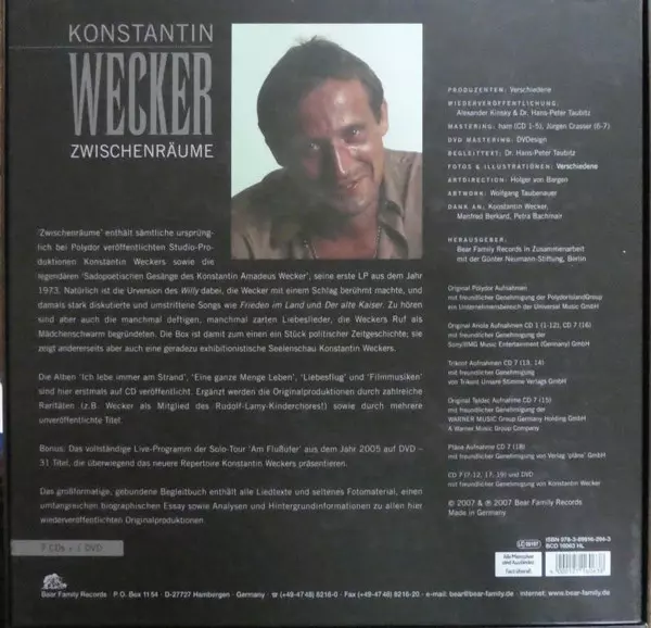 Konstantin Wecker: Zwischenräume – Die Studioaufnahmen 1973–1987 Wersja na 7CD/DVD/Zestaw pudełkowy w standardowe wydanie. Ta konkretna edycja została wydana w Niemcy w wydawnictwie Bear Family Records dnia 26. października 2006. Album sięga do gatunku Pop, Folk, World, & Country i Chanson.