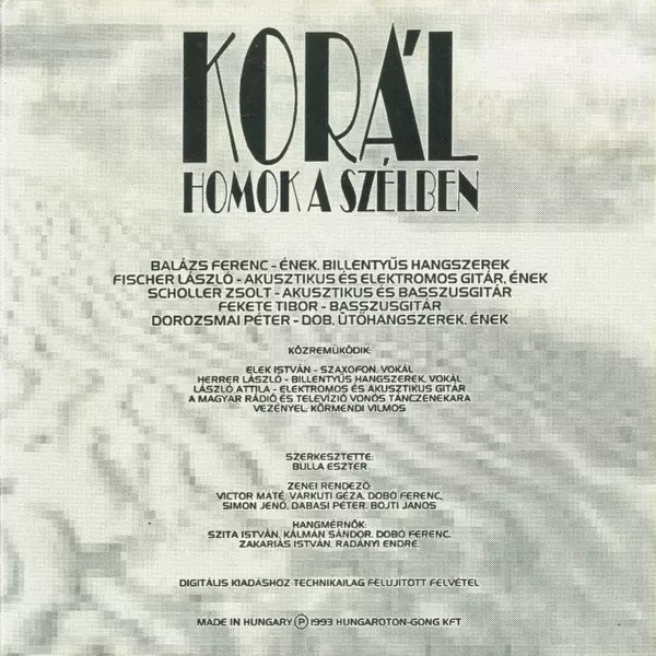 Korál: Homok A Szélben - Válogatás Wersja na CD w zremasterowane wydanie. Ta konkretna edycja została wydana w Węgry w wydawnictwie Gong dnia 12. lipca 1993. Album sięga do gatunku Rock, Pop, Pop Rock i Hard Rock.