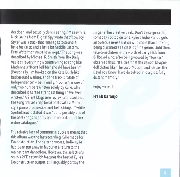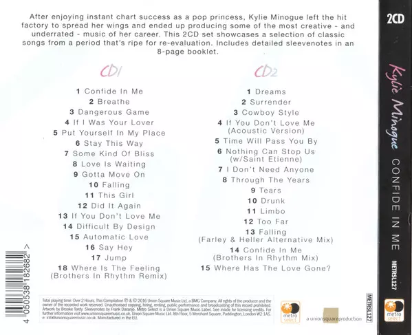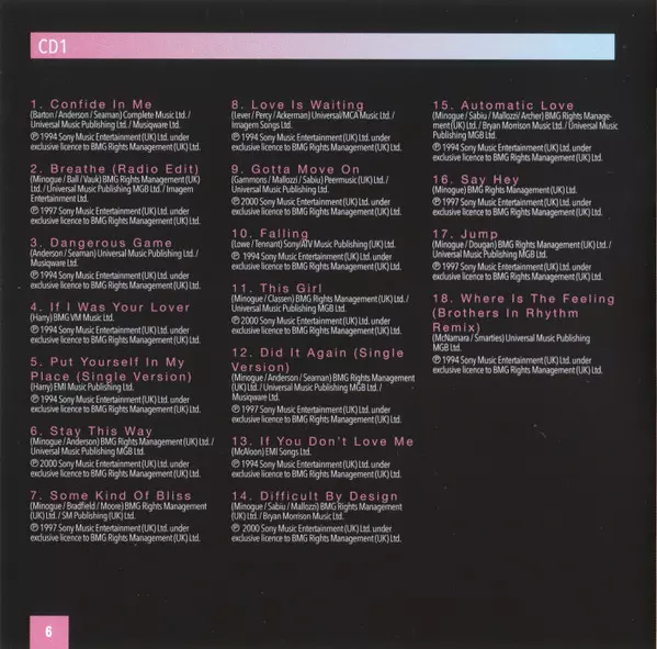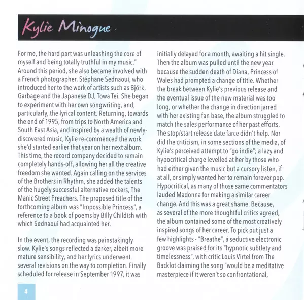 33 skladeb, které sledují proměnu někdejší teenagerské popové senzace ve vážnou popovou a taneční ikonu s více než 70 miliony prodaných desek po celém světě. Obsahuje skladby "Confide In Me", "Put Yourself In My Place", "Where Is The Feeling?", "Nothing Can Stop Us" (se Saint Etienne), "Breathe", "Some Kind Of Bliss", "Cowboy Style", "Did It Aga...