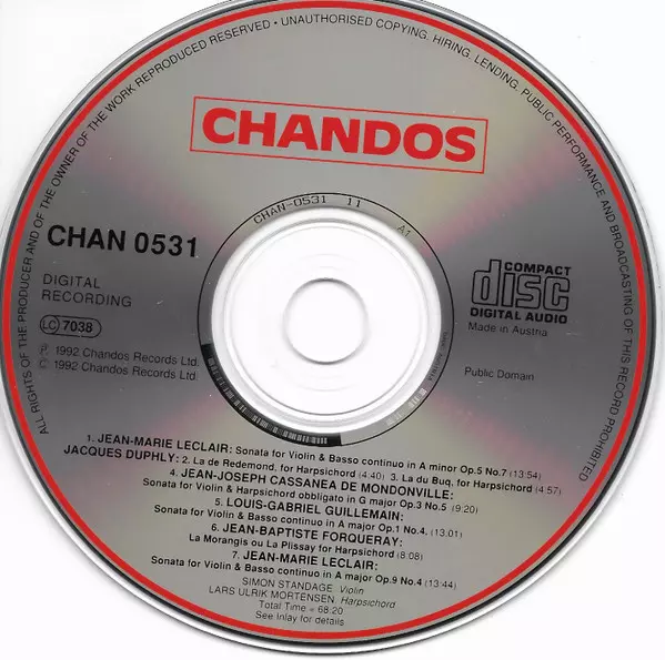| Wykonawca | Jean Marie Leclair | Simon Standage | Lars Ulrik Mortensen | Jacques Duphly | Jean Joseph Cassanea De Mondonville | Jean-Baptiste Antoine Forqueray | Louis-Gabriel Guillemain |