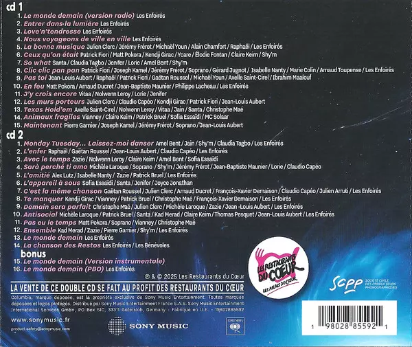 Les Enfoirés: 2025 Au Pays Des Enfoirés Wersja na 2CD w standardowe wydanie. Ta konkretna edycja została wydana w Francja w wydawnictwie Sony Music we współpracy z Columbia dnia 8. marca 2025. Album można sklasyfikować jako gatunek Pop.